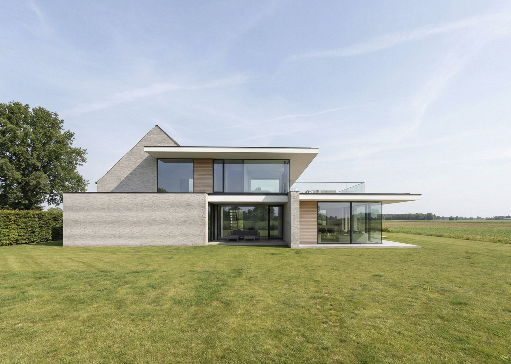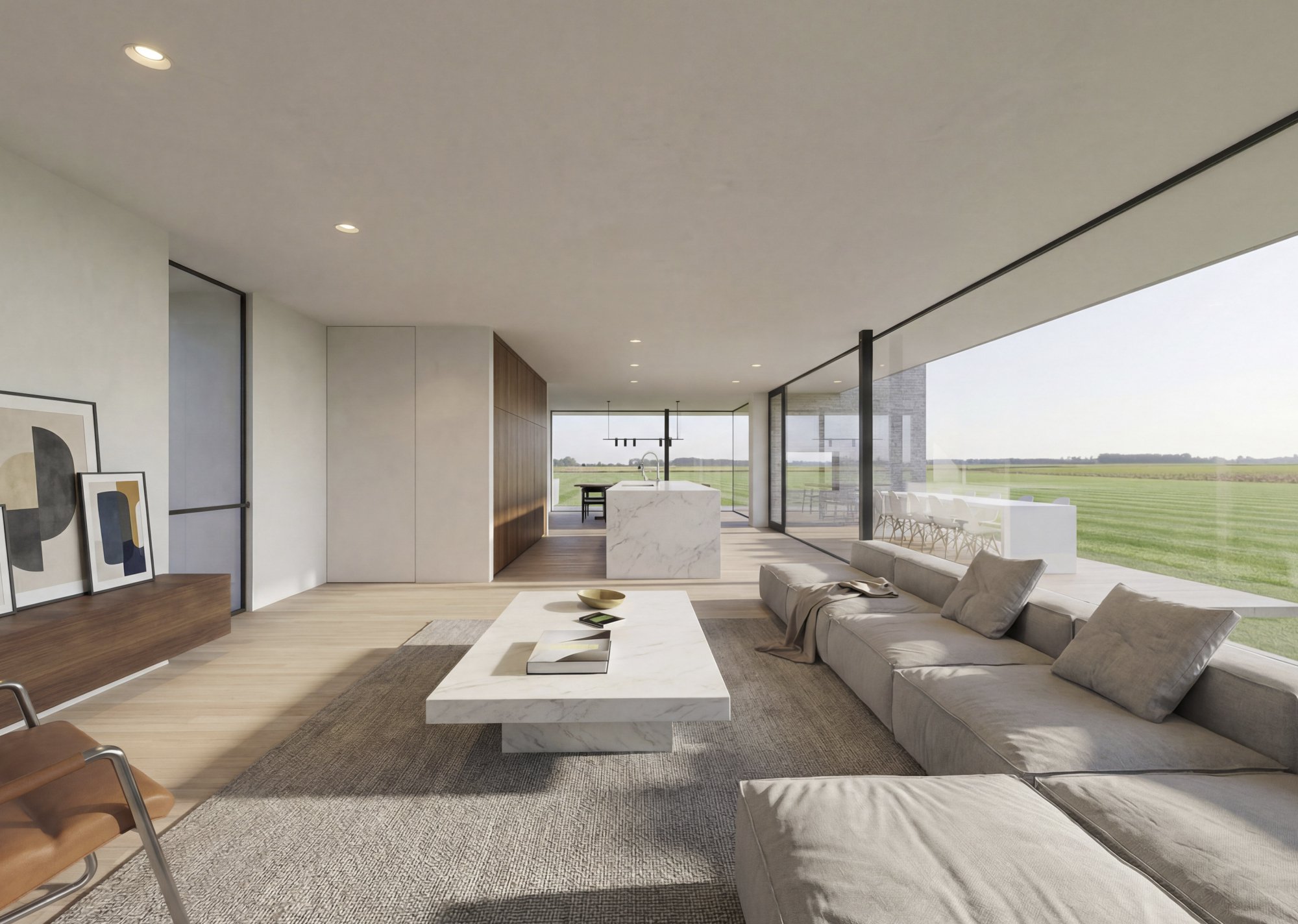 Een weidse agrarisch landschappelijke omgeving zorgt voor een eindeloze einder. Het zicht op oneindig. We hebben op ontwerpend vlak de kunst van het "minder doen om meer te bereiken" toegepast. Een ragfijn kader rondom het achterliggende vergezicht, uitgepuurd tot zijn ware minimum.