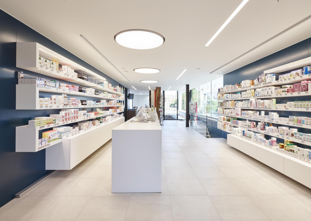 Een opvallend moderne apotheek die het straatbeeld verrijkt. Het langwerpige volume van het gebouw ontstaat door het diepe, slanke perceel, wat resulteert in een elegante en efficiënte ruimte. De voorgevel kenmerkt zich door gesloten vlakken met een subtiele verwijzing naar het apothekerskruis. Aan de lange zijgevel bieden uitgestrekte glasvlakken een open en gastvrije atmosfeer, waarbij overvloedig natuurlijk licht de ruimte doordringt.