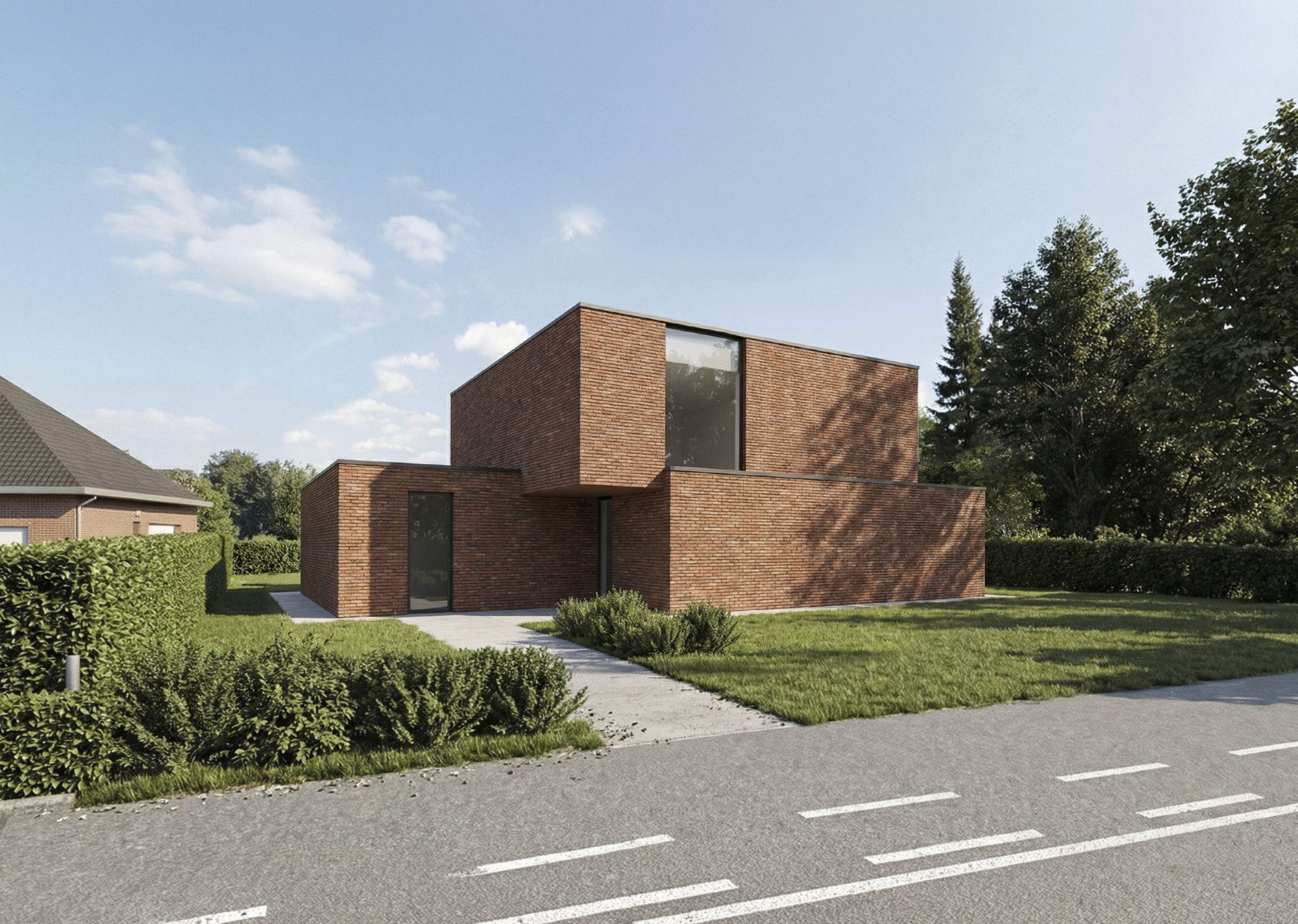 Voor het ontwerp van deze hedendaagse woning kozen we voor een spel in volumes met eerder gesloten voor- en zijgevels die zich naar achter toe openen met royale glaspartijen richting de tuin.