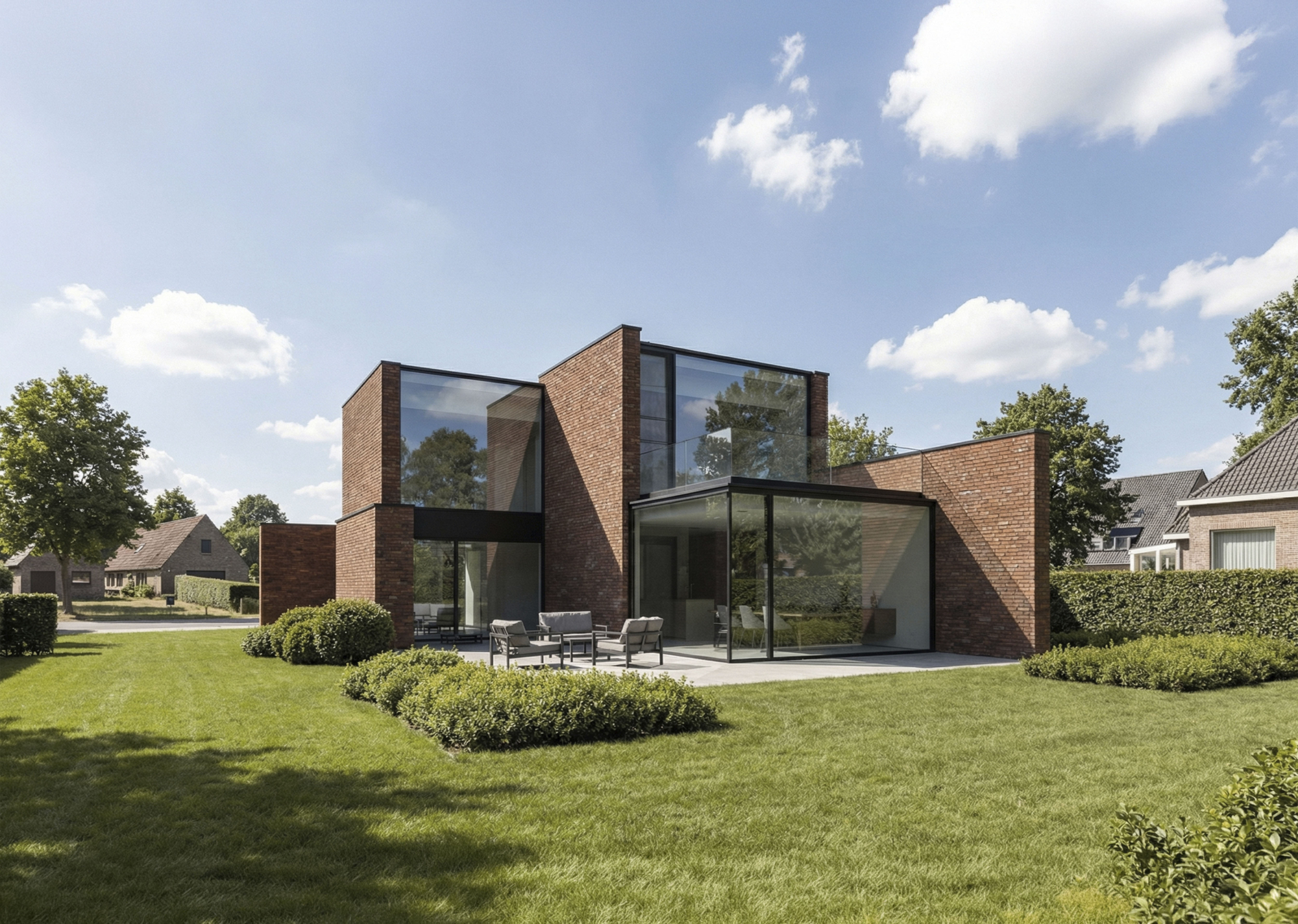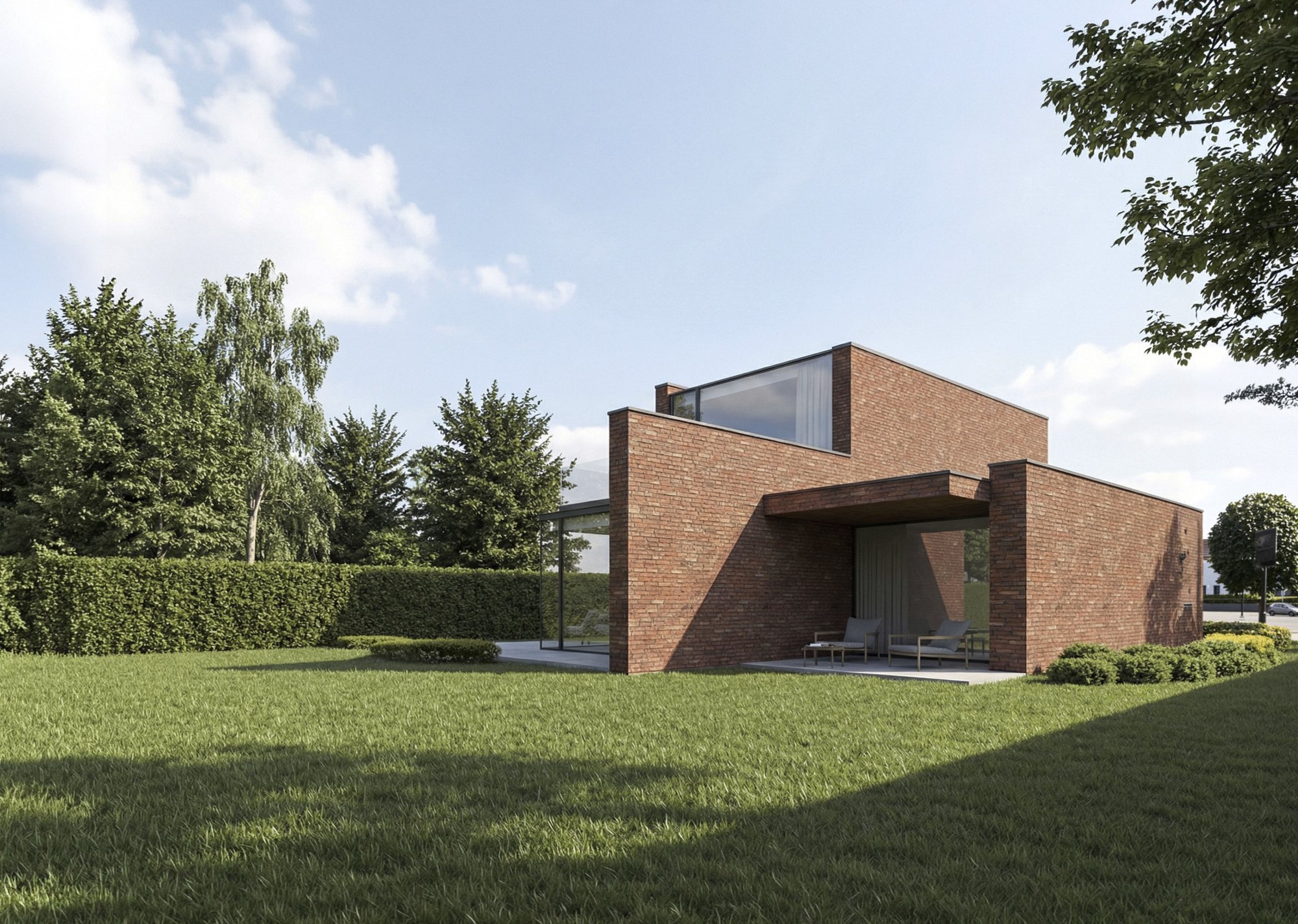 Op deze manier kan er genoten worden van mooie vergezichten achteraan terwijl er tegelijk voldoende privacy gegarandeerd wordt. Het contrast tussen de ruwe baksteen en het minimalistische glas zorgt voor een tijdloze uitstraling. Een spel van open en gesloten, van intimiteit en uitzicht: zo ontstaat een woonervaring die zowel rustig als ruimtelijk aanvoelt.
